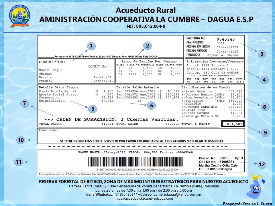 12. Datos Resumidos del Suscriptor y Factura: Se presenta un resumen clave con el número de predio, cédula del suscriptor, nombre completo, orden de lectura, municipio, número de factura, fecha de vencimiento y valor total a pagar.